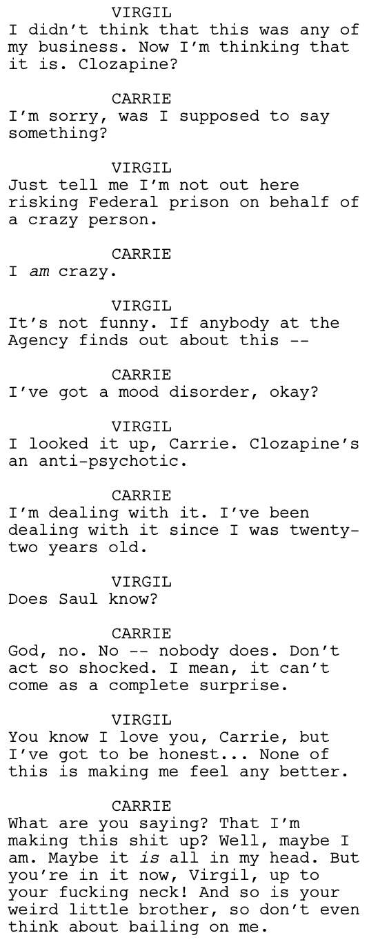 Both an increased sex drive and risk-taking are behaviours associated with the manic episodes of bipolar disorder, although their prominence in this episode probably owes more to how they serve the plot and to deliver heightened drama than it does to offering a fully-rounded portrayal of Carrie’s illness. Looking back, the writers question their own creative decisions with this scene given how the relationship between Carrie and Saul evolves, although perhaps moments such as this contribute to the true (and non-sexual) intimacy that the pair develop.