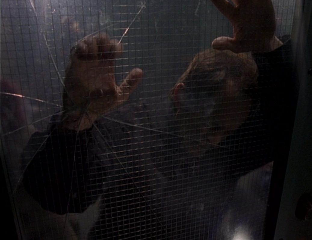 In the course of putting the book together, I revisited many, many episodes from all three seasons, yet one I hadn’t re-watched until now forms the subject of this entry: “Walkabout”. It is, in many ways, one of the most unsettling instalments of all in Millennium‘s first season, and this is in large part due to the circumstances in which we first meet Frank Black during a jarring teaser sequence. Locked in a room full of people in severe states of agitation, arousal or anxiety, he violently and repeatedly pummels the door’s reinforced glass pane in a vain attempt to escape. This is Frank Black as the audience has never seen him before at this point in the series: enraged and out-of-control. Rather than entering the scene of an horrific crime as a restrained consulting investigator, the hero’s out-of-character behaviour and subsequent disappearance represents the episode’s initial mystery.