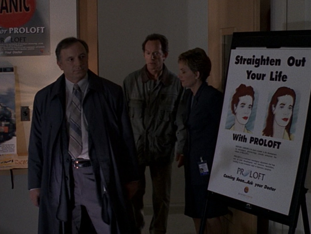 Fellow consultant and Millennium Group member Peter Watts (Terry O’Quinn) shows up at Frank’s house to seek assistance from his wife Catherine (Megan Gallagher). Frank turns up soon after, battered and unconscious, in the town where he had been on assignment, with no memory of what happened to him. Piecing together the events that led up to his disappearance, Frank is subsequently able to track down a discredited doctor that he had visited, and who monitors experimental and clinical trials of as yet unapproved prescription drugs. Frank subsequently learns that he was present during such a drug trial, but that another substance was unwittingly taken by the participants through a water dispenser—one that led to the frenzied behaviours seen in the teaser sequence. Sandy Geiger (Alison Matthews), a forensic lab technician, explains what that substance was: