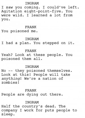 Society’s blindness to such overprescription is the central conceit of the episode’s antagonist, Hans Ingram (Gregory Itzin), who works for the pharmaceutical company that markets Proloft. Disillusioned with his work, his scheme is to highlight these dangers by giving people a drug that has the opposite effect. Having initially contaminated the water that Frank Black drank at the family clinic, Ingram’s final dramatic statement is to have free samples of the drug handed out at an office location. Mass panic ensues, all of which Ingram observes via cameras from the building’s security room. It is here that Frank Black confronts Ingram, who explains his spurious motive: