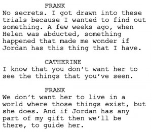 Frank’s facility is first introduced as being both a gift and a curse; it enables him to see into the minds of killers, but it also poses a risk to his own sanity. Prior to the start of the series, he has retired from the F.B.I. having suffered a breakdown. In “Sacrament“, a preceding episode, Frank’s daughter Jordan (Brittany Tiplady) first shows signs that she may have a similar facility to that of her father in the wake of her aunt’s abduction. It transpires that, fearful for what her future may hold in store, Frank had explored the nature of the trials to seek a potential cure for his “gift”.
