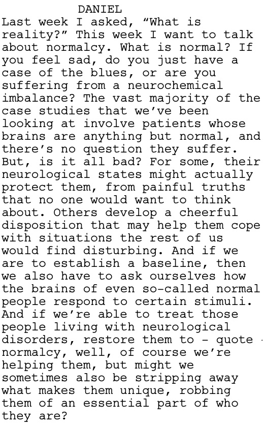 Dr. Pierce’s closing speech to his class offers further food for thought. In challenging what it is to be “normal”, it blurs the lines between mental wellness and mental illness in a way that encourages consideration of the individual: