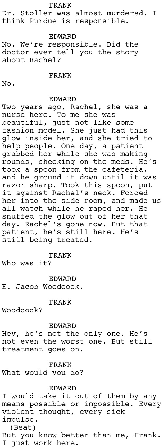 As one thread in my essay—”Evil Has Many Faces”—for the book Back to Frank Black, I wrote about the model of evil as a contagion, and its ability to take hold of any one of us as a result. Evil is, of course, a nebulous concept that defies any absolute definition, but perhaps something similar can be said of mental illness under certain circumstances. Edward was clearly affected by what he saw Rachel, his former colleague, endure. It is strongly implied that her mental health suffered in the wake of her attack, and perhaps the same can be said for Edward himself.
