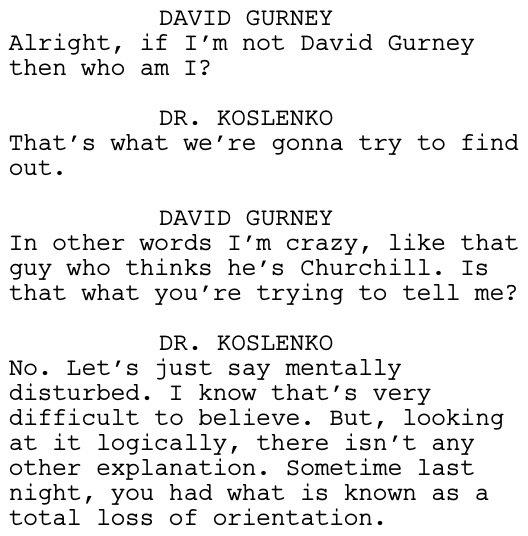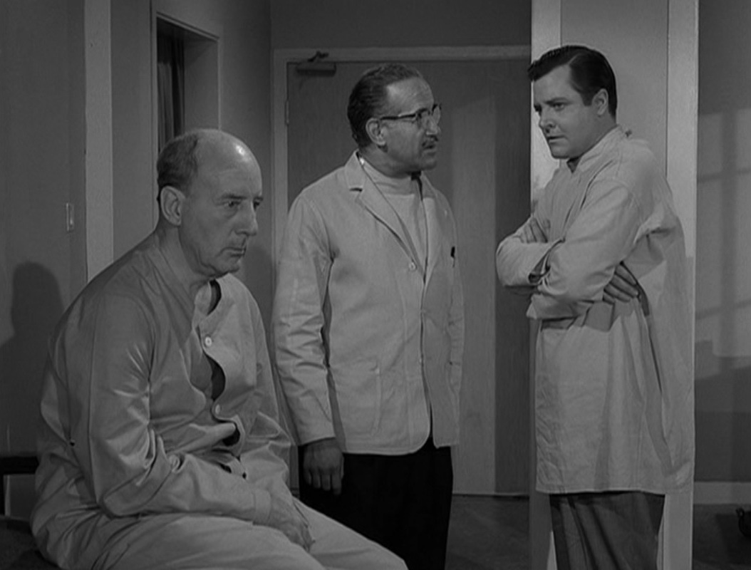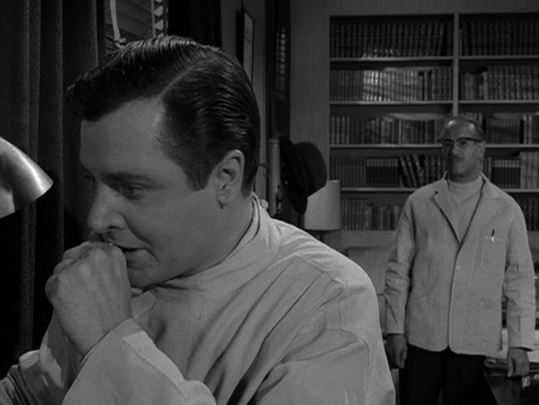 The episode focusses upon David Gurney (Richard Long), a man who wakes up one morning, fully-clothed, on a bed next to his “wife” who, much to her horror, claims to have no prior knowledge as to the man in her bedroom. A similar scenario greets Gurney at his workplace, leading to his arrest. Thereafter he finds admitted to a mental hospital, where he is attended to by a Dr. Koslenko (Frank Silvera). Koslenko engages with our increasingly excitable protagonist to try to explain that “David Gurney” does not exist: